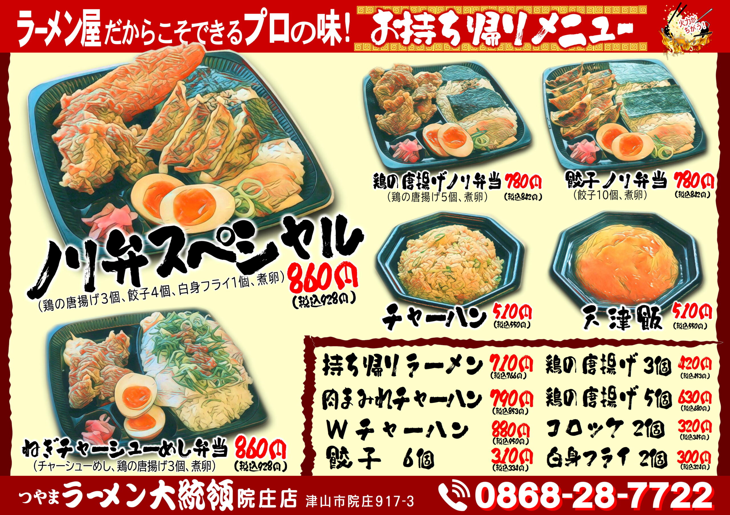 つやまラーメン大統領のテイクアウトメニューをお届けします。