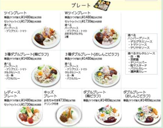 | 3種ダブルプレート(梅ピラフ) | 単品(サラダ添え)1,598円 |