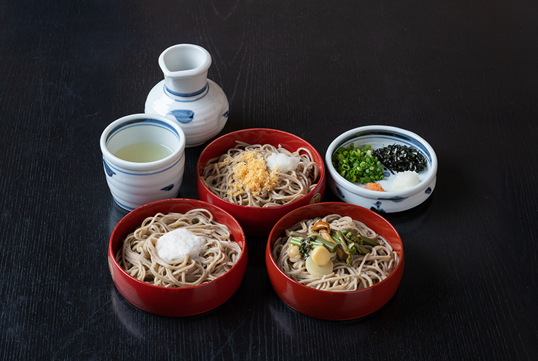 色々な味付けが楽しめる五段重の蕎麦は見た目も華やか。