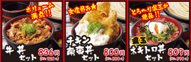 セットのうどんは、かけ釜揚げ(温)またはぶっかけざる(冷)からお選びいただけます