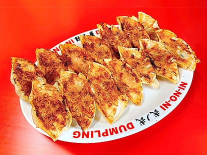 看板メニューの焼き餃子は、片面がパリッパリに焼き上がった一口サイズの餃子☆