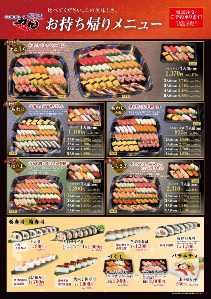 回転寿司 力丸のテイクアウトメニューをお届けします。