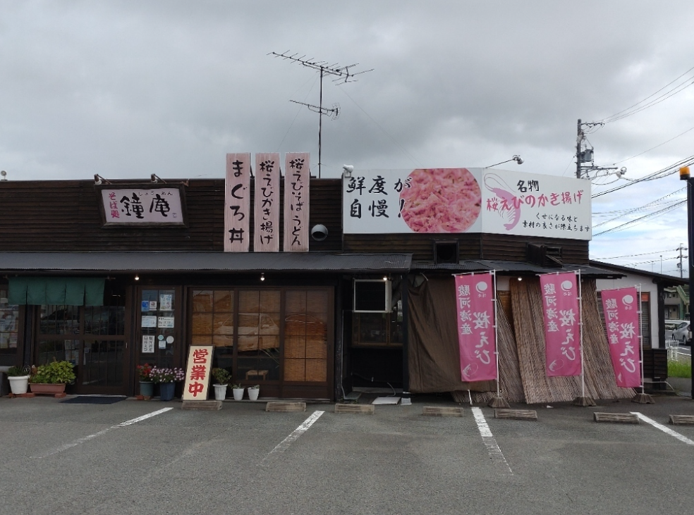 桜えびそば・うどんは鐘庵の看板メニューで、桜えびのかき揚げはサクッとした食感があります。