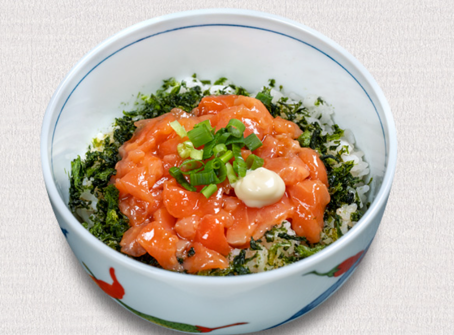 サーモン丼は、ポン酢の入った自家製ダレで味付けしてあります。