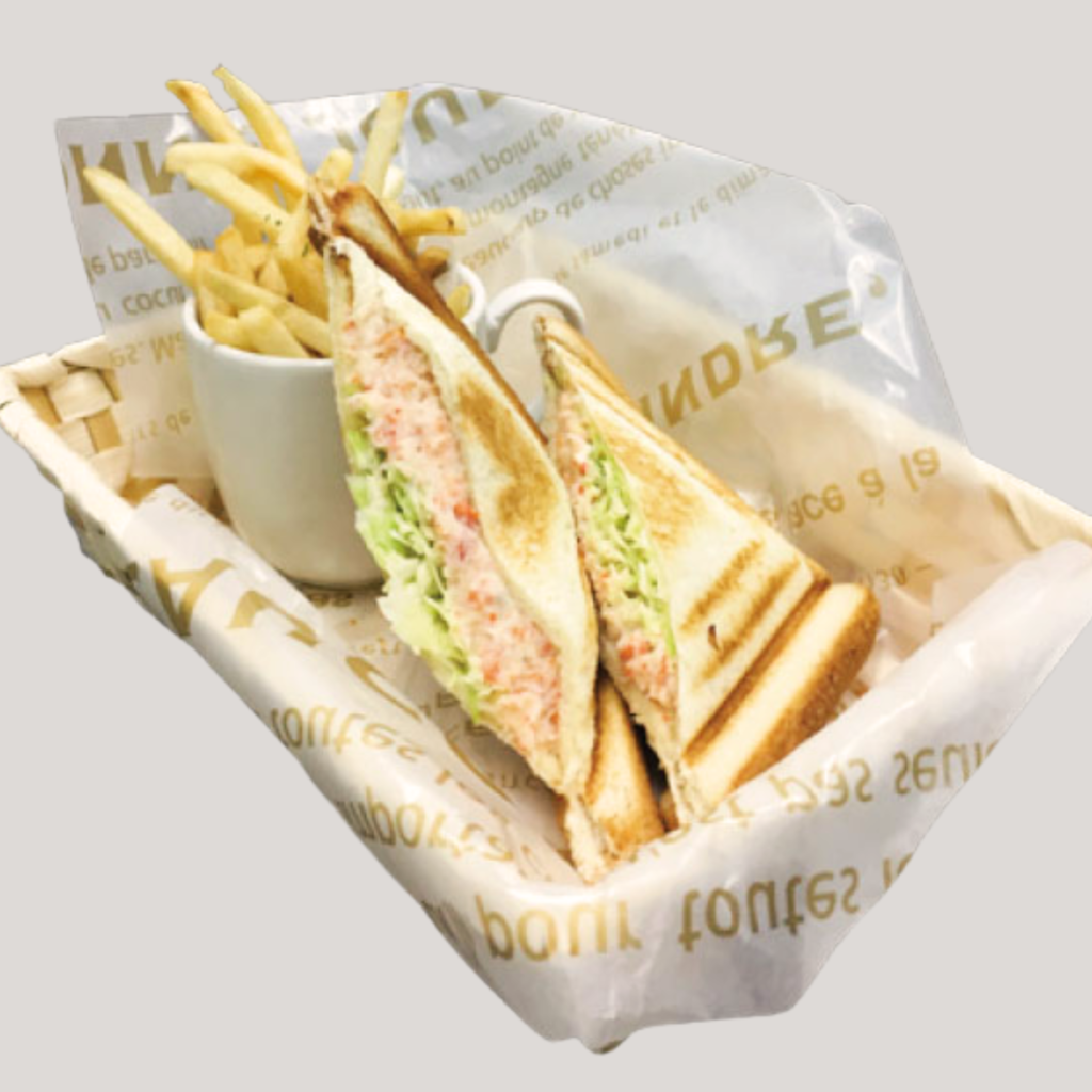 かにのほぐし身とホワイトソース、 野菜をはさんだ、かにホットサンドが人気メニュー♪
