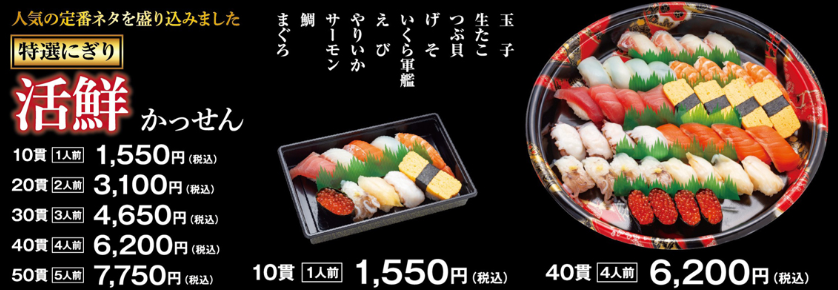 特選にぎり活鮮には、玉子やいくら軍艦、サーモン、まぐろなど定番の人気のネタが勢ぞろいです☆
