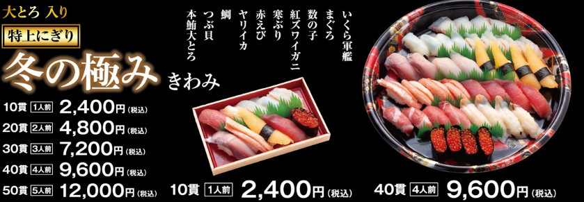 特上にぎり冬の極みは、定番のまぐろはもちろん、ヤリイカ、鯛、なんと本鮪大とろが贅沢に入っていますよ♪