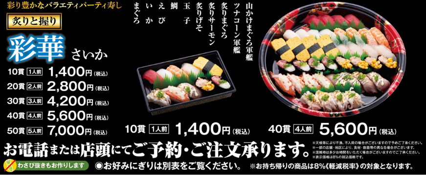 彩り豊かな炙りとにぎりの彩華は、変わりネタの山かけまぐろ軍艦や炙りまぐろ、炙りサーモンと、バラエティに富んだ寿司ネタでパーティにぴったりです☆