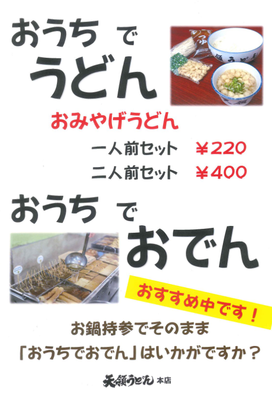 ご自宅でおうどんを楽しむ以外にもおでんや牛丼パックもテイクアウトが出来ます。