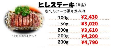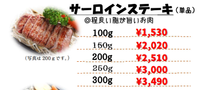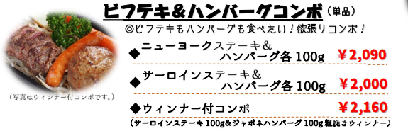 | ウィンナー付きコンボ (サーロインステーキ&ジャポネハンバーグ100g粗挽きウィンナー) | 2,160円 |